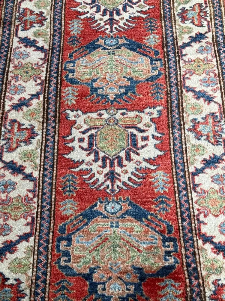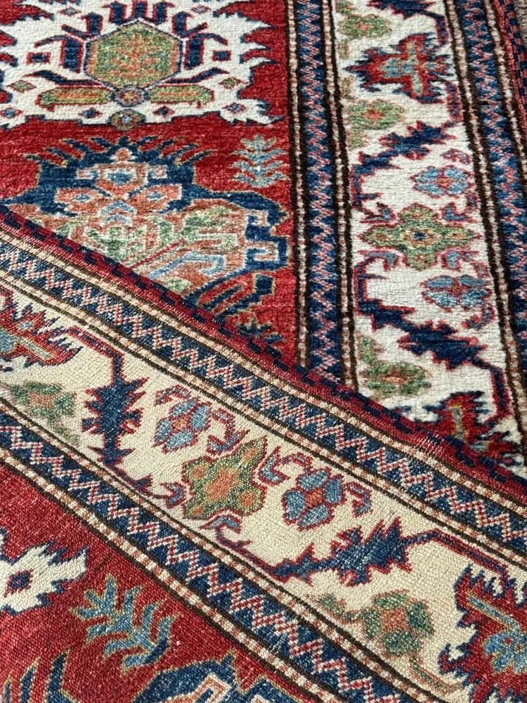 Un magnifique tapis de galerie Kazak, coloré, traditionnel et plein de caractère, parfait pour les amateurs de tissages caucasiens authentiques.