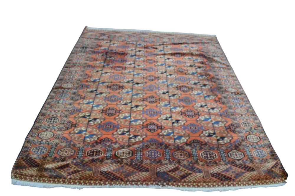 Tapis Boukhara ancien, provenant de Russie, en laine, mesurant 241 x 188 cm, aux teintes chaudes orangées. Son motif traditionnel Boukhara, richement travaillé, apporte rythme et élégance à tout intérieur.